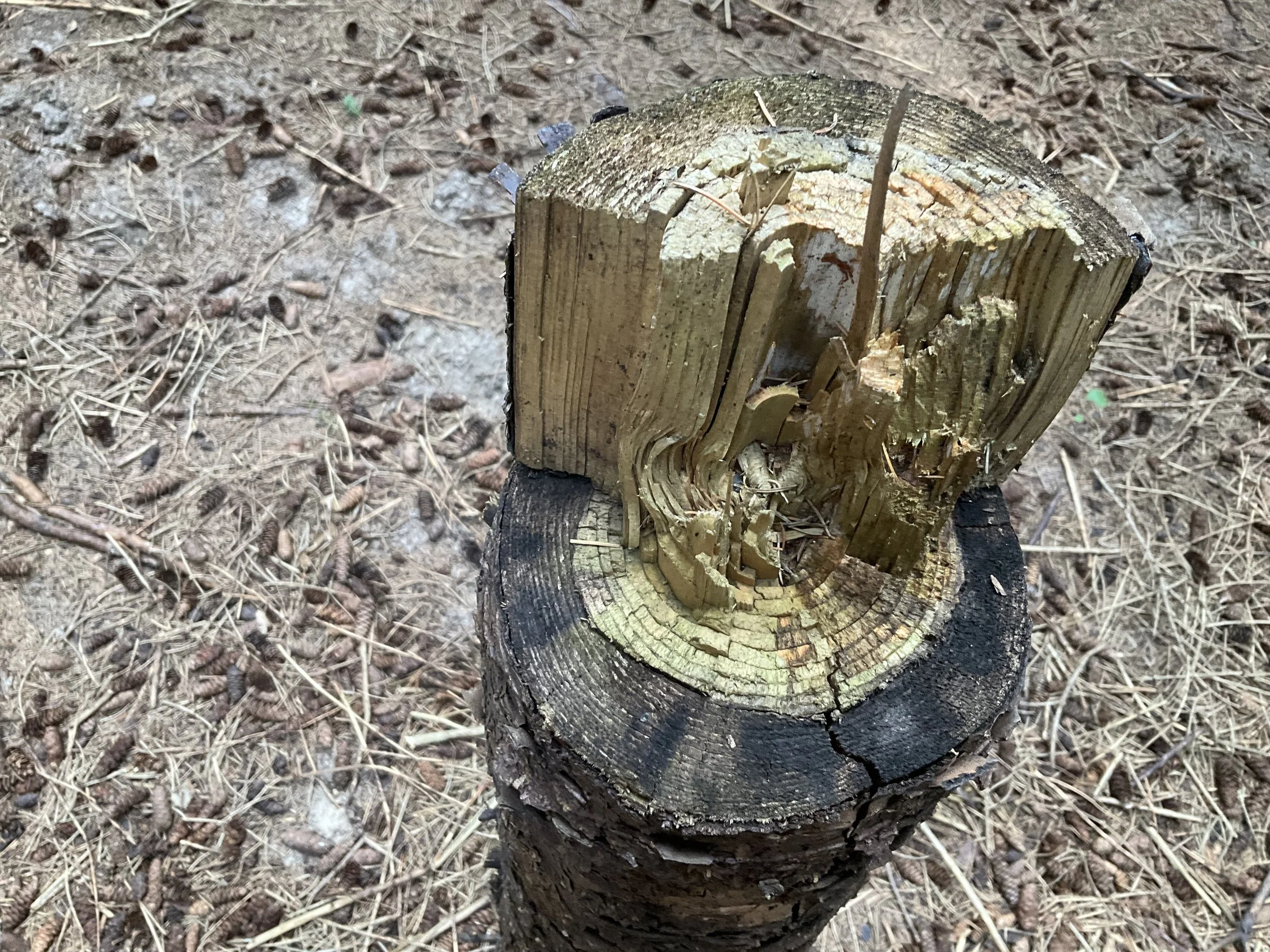 Here is one of those girdled spruce trees. Notice how the growth rings had slowed (gotten smaller) considerably before we girdled it and killed the trees. This shows us the “stand of trees" was in need of a thinning (growth was slowing).