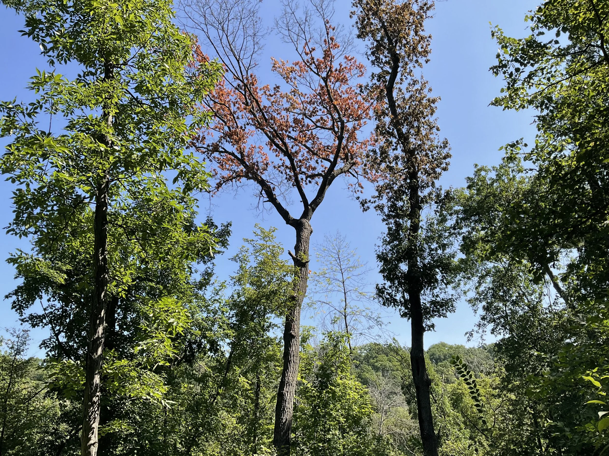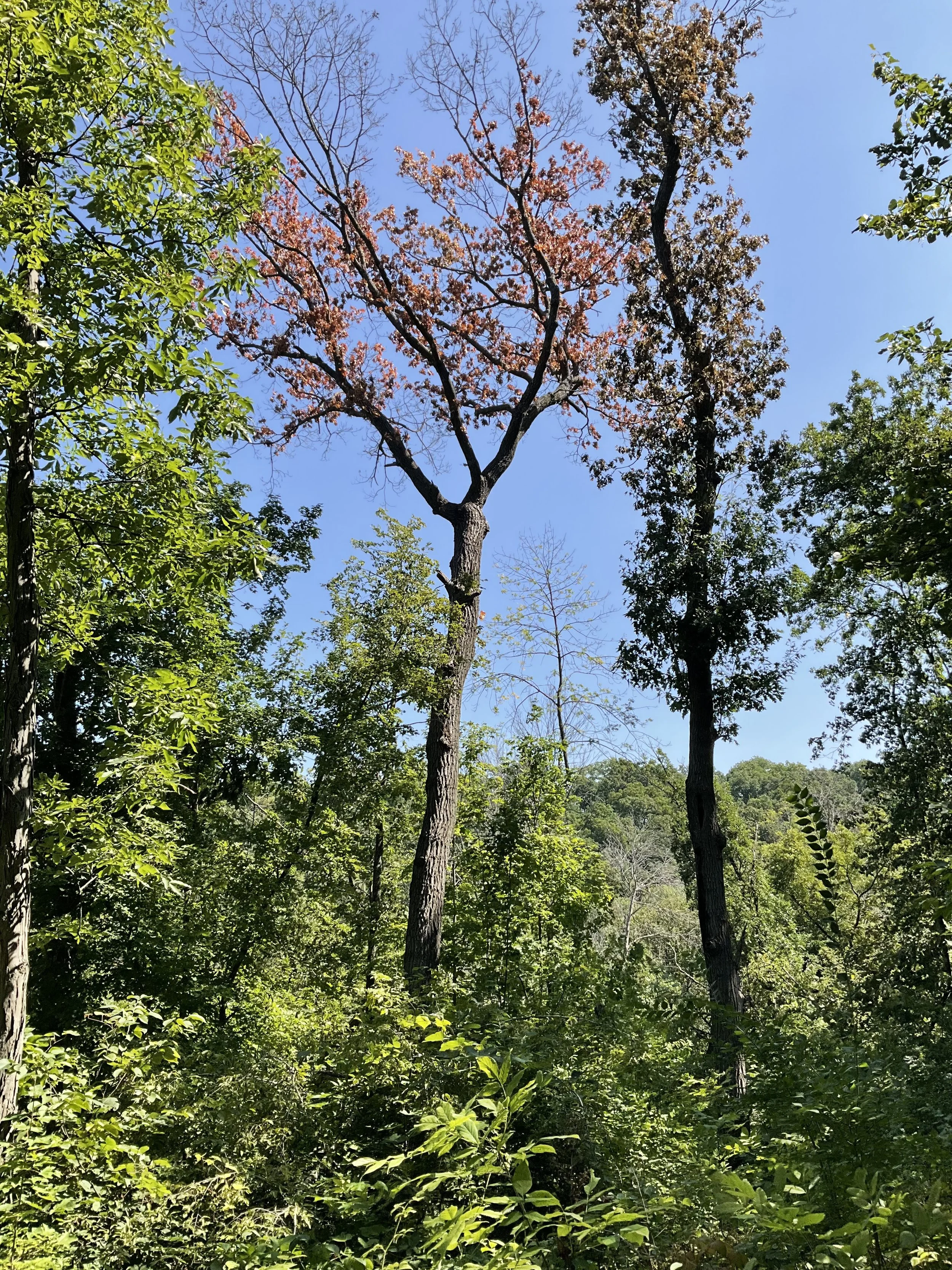 August is when oak wilt shows up. Red oak and black oak turn from “green to brown” almost overnight. Seeing a red oak or black oak look like this in August is often times oak wilt.