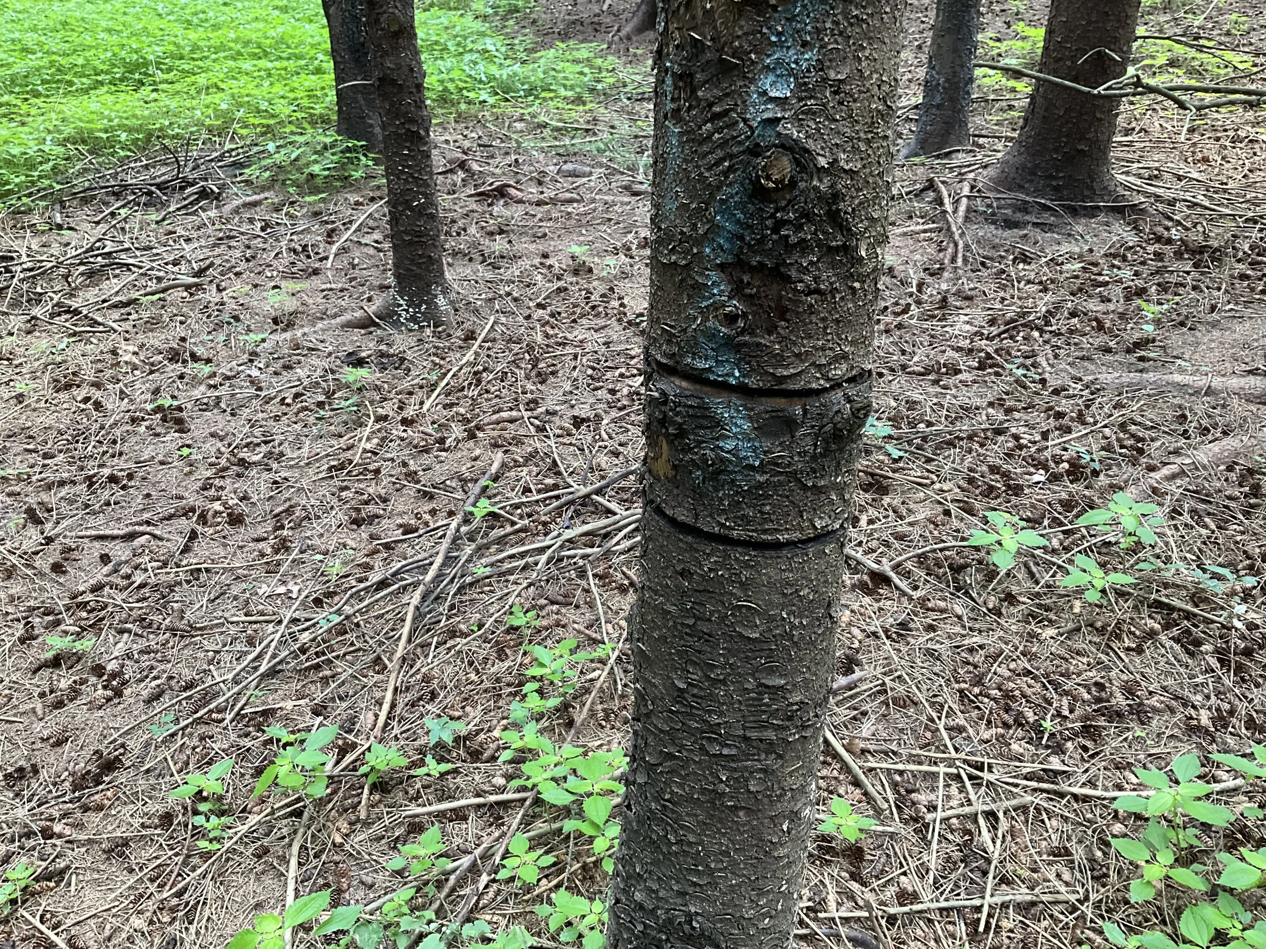 Girdling most trees with two “frills” is effective. Conifers are a bit easier to girdle than hardwoods. Some persistent trees like locust may require herbicide application in the “frill”. Basal bark herbicide application is another option for some situations.