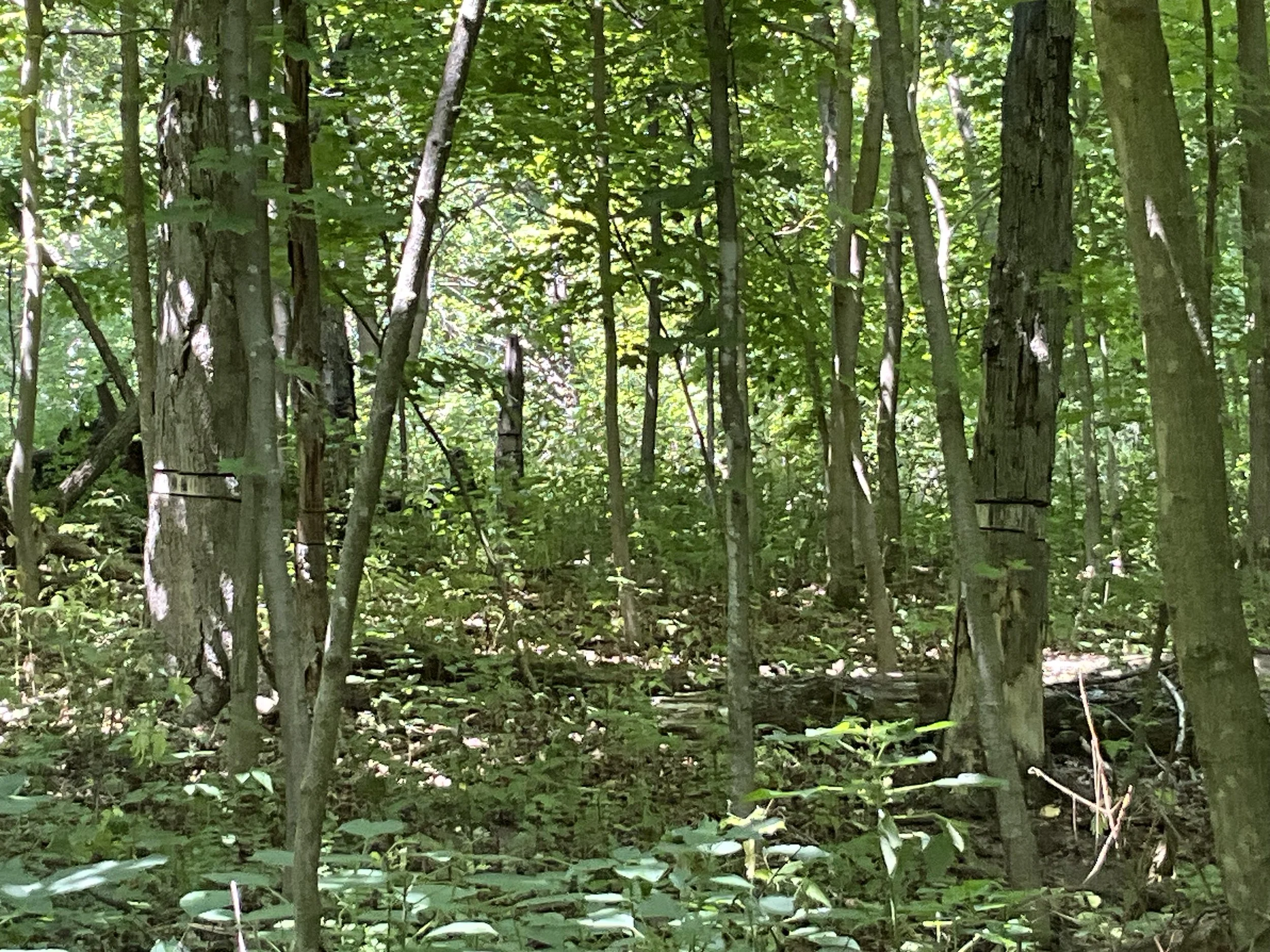 Emerald ash borer (EAB) is quickly eliminating ash trees from our landscape. Note the dead trees in the background and the dying trees in the foreground (bark starting to fall off—woodpeckers moving in). In a woodland setting there is not any economically feasible way to stop or slow this from occurring.