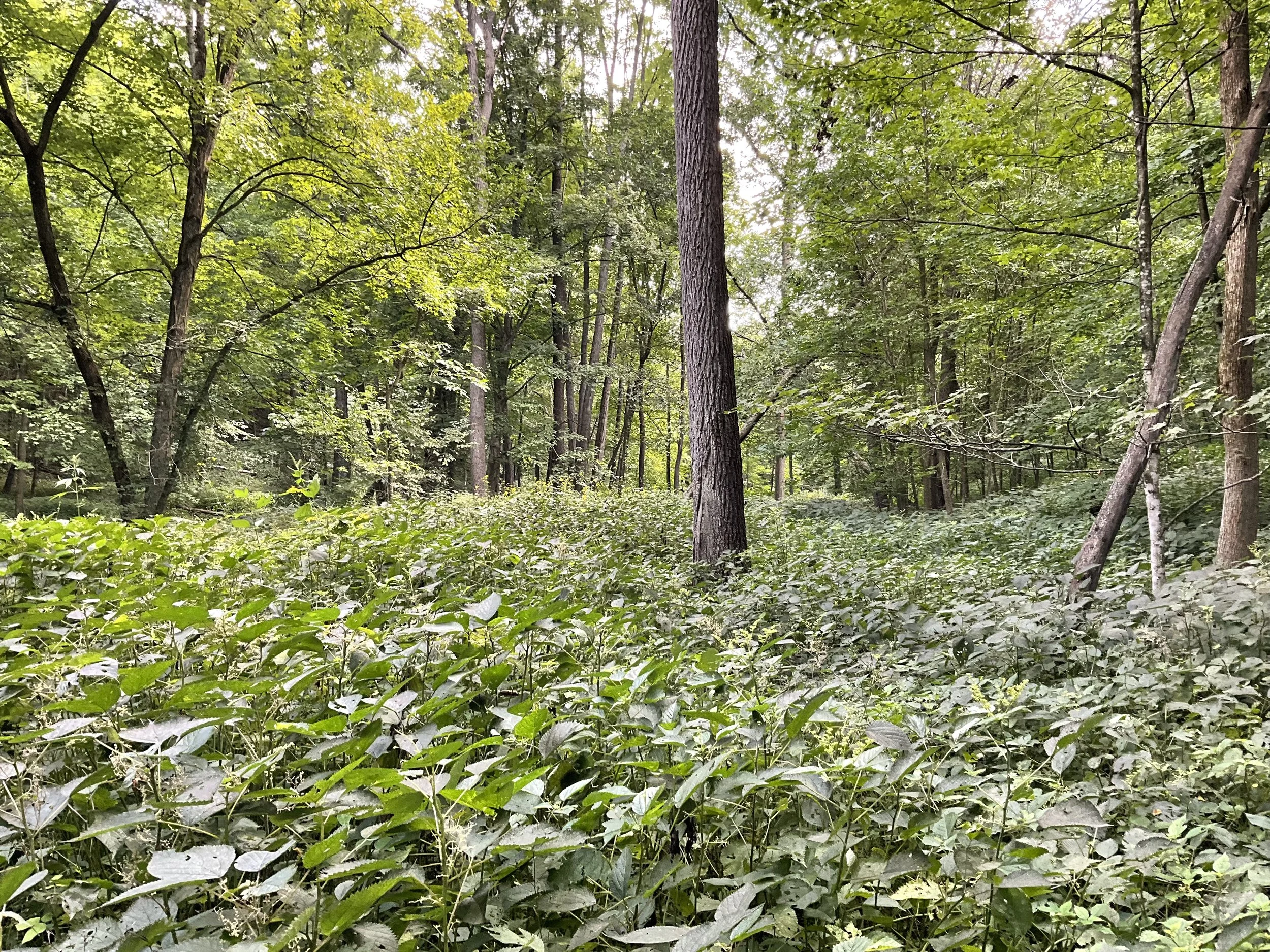 Often times in the creek bottoms you will find dense woods nettles on the forest floor under large scattered walnut trees.