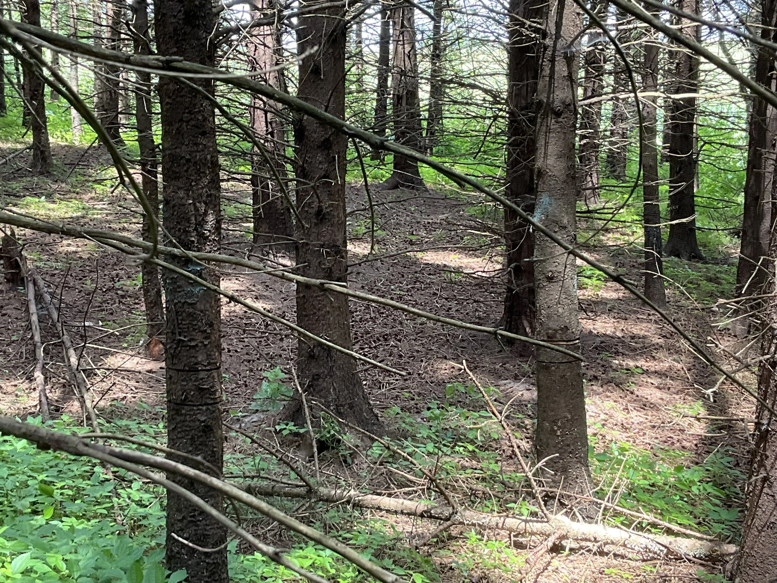 This spruce stand was too small to feasibly commercially thin (not enough volume-poor markets for the product), an alternative is to complete a non-commercial crop tree release…..girdling the unwanted trees (allowing them to die standing), allowing more room for the desirable (crop) trees to grow freely.
